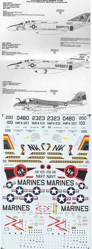 This sheet has two of my favourite aircraft on it. Both of them F-4 Phantoms! All three subjects are from the 1976/77 time frame aboard the USS Coral Sea (though I've had e-mails that state USS Enterprise). The two F-4N Phantoms are both CAG birds so more colorful than the average aircraft.
