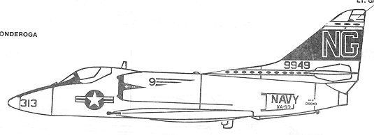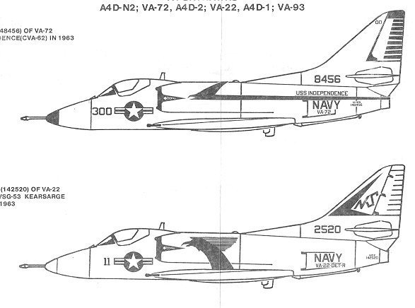 The first aircraft is an A4D-1 of VA-93 off the USS Ticonderoga in 1958. It has the blue tail band and the blue/white lower tail markings typical of this unit.