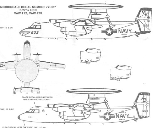The other is from VAW-123. From the side it is boring as heck, but on the top of the rotodome is a huge spiral decal that takes up a goodly part of the sheet. This will make for quite an eye-catching scheme!