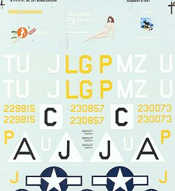 The first plane on the sheet is 'Miami Clipper' from the 91st Bomb Group. Though the plane looks pretty normal, it is suggested that this plane had yellow de-icer boots on it. Sounds a bit strange to me that someone would put such a color on the leading edges of such a large plane.