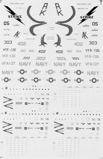 Anyway, there were at least four new fleet hornet squadrons established, two of them are on this sheet. All aircraft are a very uncolorful combination of greys and so I have scanned the sheet in greyscale. That accounts for the grey background.
