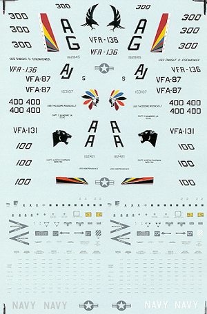 First aircraft on the sheet is from VFA-136 aboard the USS Dwight D. Eisenhower. AG/300 has the CAG colors on the fin in a nice sunburst pattern.