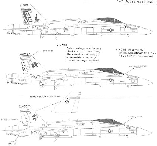 Again, all of these markings are for an F-18A and not the later C model. There are very good kits of this plane in 1/72 from both Fujimi and Hasegawa. Most will undoubtedly choose the less expensive Hasegawa kit and I'm sure that which ever is chosen, a fine model will be made from it.
