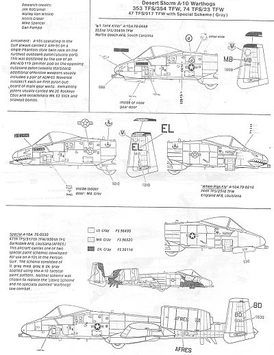 This sheet covers three tank killers from the Gulf War. The first two are in the standard European 'lizard' camouflage of FS 34102, 34092, and 36081. First is '#1 Tank Killer' from the 353rd TFS/354 TFW at Myrtle Beach, SC. It has only red fin tips for any color.