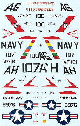 The first subject is a VF-41 Demon from the USS Independence. This aircraft is also the CAG bird so has the required multiple colors on the tail. It also has a red ship name on the fuselage spine, a very unusual treatment.