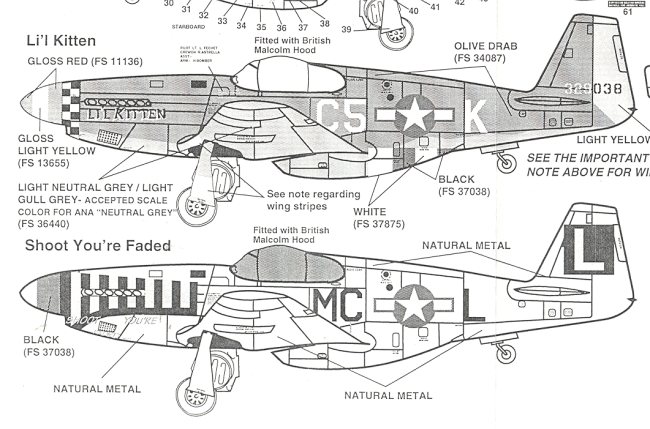 This sheet is much unlike earlier Mustang sheets. It not only gives only two aircraft (instead of the 4 or 5 of older sheets), it gives a full data suite for both planes. you'll have a fine time adding all that stuff to your small scale Mustang!