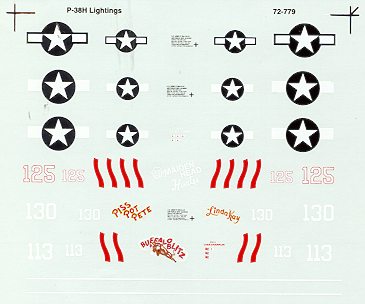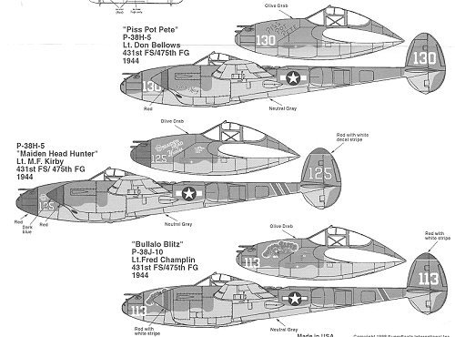 The lone P-38J is ' Buffalo Blitz', also from the 431st. This one has actual nose art to go with its lone tail and spinner stripe. Like the previous plane, it has a red tai tip with white stripe. Superscale provides the white stripes.