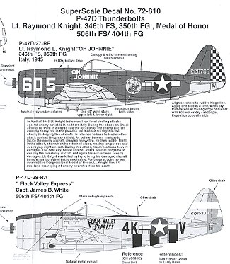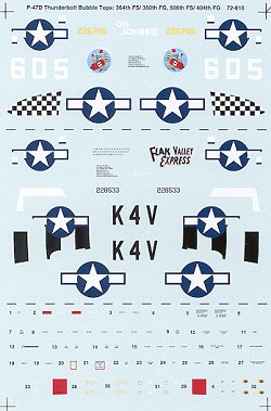 This sheet contains two P-4Ds; one in camo and the other in bare metal. Modelers are fortunate in that there are a number of good kits in 1/72 for this aircraft. Hasegawa, Revell AG and Academy all make excellent kits and there are others that are not really that bad for which these markings should fit.