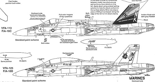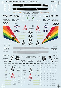 Rare it is to find a twin seat set of markings, but this next plane is a later build F-18B with the West Coast training squadron, VFA-125, based at LeMoore, CA. Both of these markings have been sized to the Hasegawa kit, though I see no reason why they shouldn't also fit Hornet kits in this scale.