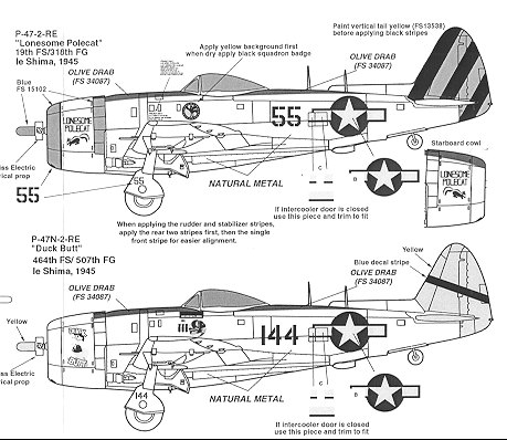 The other aircraft is 'Duck Butt' from the 464 FS/507 FG, also at Ie Shima. This one has a yellow prop hub and yellow tail surfaces, but with only a single black stripe on the fin/rudder. The aircraft also has yellow wing stripes, which are also provided.