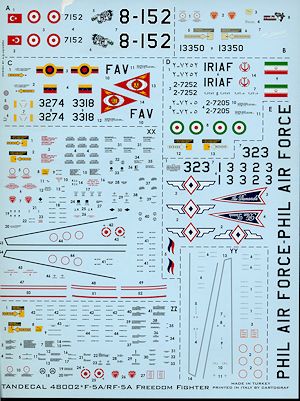Tandecal is a new player in the decal market. These folks are based in Turkey and like many, have their decals printed by Cartograf in Italy. They have chosen a very logical sheet for their first one and that is on the F-5A Freedom Fighter. Thanks to the recent kit by Kinetic, we have a superb early F-5 kit that can be built in several ways, which is perfect for this sheet as some of the Turkish F-5s are actually ex-Dutch NF-5As. However, none of those are on this sheet though there is an RF-5.