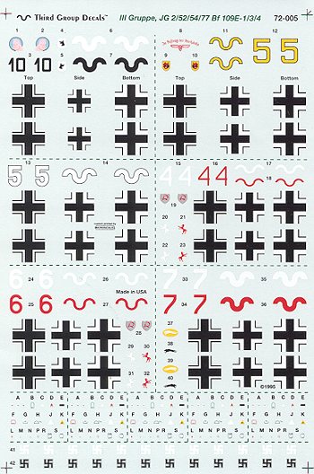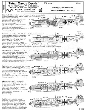 Anyway, this sheet has six subjects on it as well as enough common markings to enable you to build all six. I have used Third Group decals before and they have worked just great. This sheet is dated 1995, so it isn't exactly a new sheet. Just new to me. All aircraft on it are either E-1, E-3 or E-4 variants. As of this writing (Feb 2001), there is not dedicated E-1 kit produced in 1/72 scale. The biggest changes are in the wings, so I hope someone produces a conversion for it.