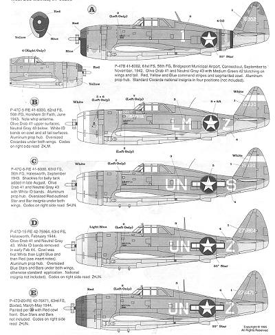 The sheet also includes a couple of most unusual P-47s. First is a fictitious one that was the subject of a painting. The other is a very late P-47M that was used as a Victory Display in Paris. Zemke never flew this particular aircraft.