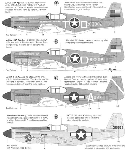 This sheet has four of these early Mustangs (well actually three, but read on). The first two are the same plane at various times in its life. This A-36 is a 527 FBS plane from Algeria in June of 1943 and would be in pristine shape. 60 missions later, it looked like the second plane and was a lot more weathered!