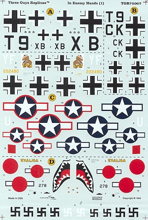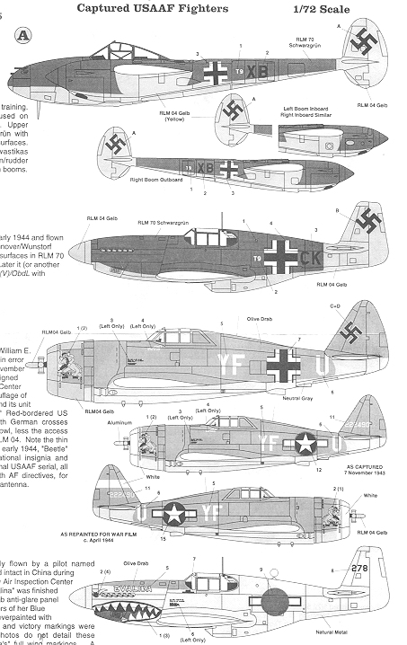 The third aircraft is a P-47D. This plane is shown in several markings. It was never repainted in German colors, though the nose was painted yellow and the US insignia was over-painted and replaced by German. An addendum drawing shows that this plane also had a yellow rudder. The sheet also offers its US markings it wore when shot down. It can also be built in slightly different markings as used in a German movie.