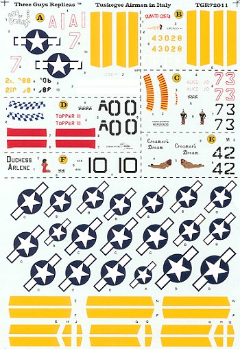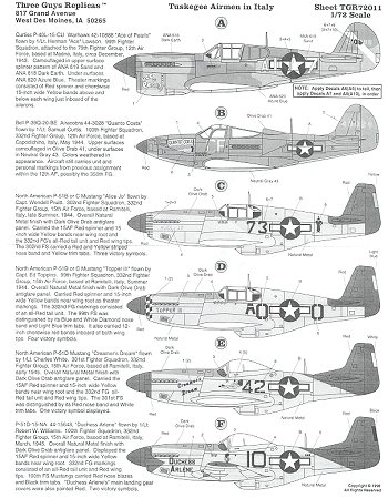 This sheet covers six aircraft and four different types. Being 1/72, there are is enough room on the sheet to cover all the markings needed to build all 6 aircraft shown. There are also models of all but the P-40F readily available.