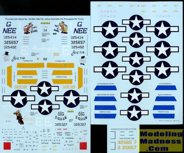 There are enough data markings for at least one plane and you'll note that you get a lot of insignia. This group placed its insignia behind the intercooler outlet doors so no need to split decals. The decals are superbly printed by Cartograf. The markings are designed for the Tamiya kit, but should fit the Hasegawa or Monogram kit without any issues.