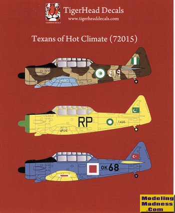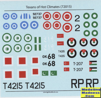inches. It also contains no stencils, only the unique markings and insignia. What's more, there is no placement guide included. For that, you need to go on-line to obtain that information. The header card for the decals mentions nothing of this requirement nor did the item description from the place from whence this was purchased. Apparently this sheet is also available in 1/48 as the .pdf file one downloads is for that sheet.There are six options on the sheet. All the drawings show them to be later T-6Gs, but it is quite possible that some may be Harvards so it would behoove the wise modeler to find some photos just to be sure, unless you don't care.