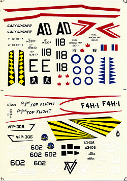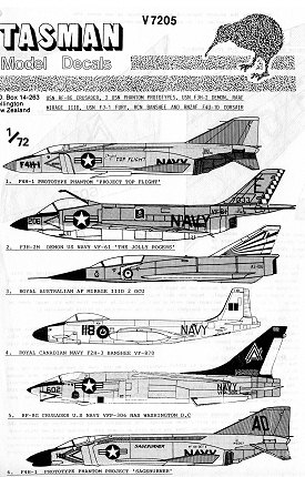 Today, there are injected kits for some of these options that could only be found as vacuforms, including the Demon, later Banshee, and FJ-1. I think that the two seat Mirage is part of the PJ Production line-up of resin kits. Still no injected early F-4A, or RF-8, though Falcon and Ventura do/did make conversions. Also, the white markings are barely visible against the ivory background of the sheet.