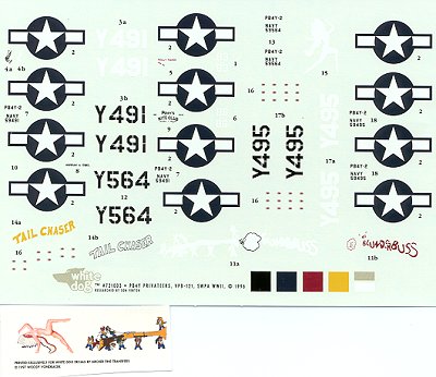 There are three aircraft portrayed on the sheet, of which two have nose art. All are in the tri-color scheme and quite faded. The instructions show any repainted areas. There are markings for all three planes included on the sheet. Probably the biggest hurdle will be finding the Matchbox Privateer kit. This kit is not exactly easy to come by. Hopefully, Revell of Germany will reissue this sometime in the near future.