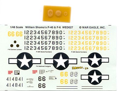 You are given decals to do three planes flown by Wm. Shomo, a.k.a. the Flying Undertaker, whose claim to fame is six (or was it seven) kills on a single day. The first is a very standard P-40N whose only distinguishing mark is the number 66 on the nose. There is no indication of any camera ports on it as Shomo basically flew armed recce birds.