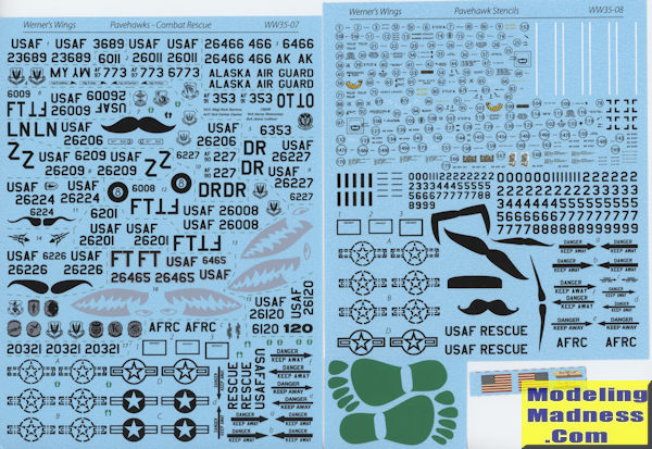 This set is designed for the 1/35 MRC/Academy kit. As you know, there will be a need for upgrade bits to do a proper helo and Werner's Wings has all you need at their website to properly model this version so see them at the link in the stats box. There are planes from the regular USAF as well as the ANG and AFRC. At least one Alaska ANG plane is equipped with skis. The HH-60 is call signed 'Pedro' so you get a variety of moustaches as some of the planes have on the nose.