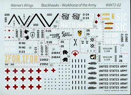 This sheet will fit any appropriate 1/72 kit and just off the top of my head, I'm thinking that Fujimi, Revell/Italeri, Hobby Boss and Hasegawa do Blackhawks. There are probably others, but I don't recall them at the moment. Like the 1/35th and 1/48th sheet, there are no fewer than 26 different markings options, covering the time period from its introduction to those flying today. Most are in army helo drab with some in desert tan. Rather than go through a long list of what is in the sheet, I'll give you a brief rundown of what is there. There are a bunch of medevac helos because that is what one of their primary missions happens to be. There is a training helo from Ft. Rucker with an international orange door as well as one from South Korea with yellow bands. Two are Desert Storm helos and there are helos attached to KFOR, IFOR, and SFOR. Most of these have been given names to add to the interest.