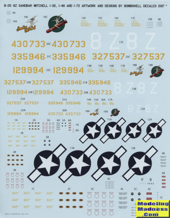 There are markings on the sheet in all three scales so it doesn't matter what scale is your favorite. Fortunately, there are very good kits of later war B-25Js available in all scales. The Cartograf printed sheet provide prop markings as well as other stencil and data markings. You also get insignia for the 1/72 and 1/48 plane, but there simply isn't room on the sheet for these in 1/32 scale.