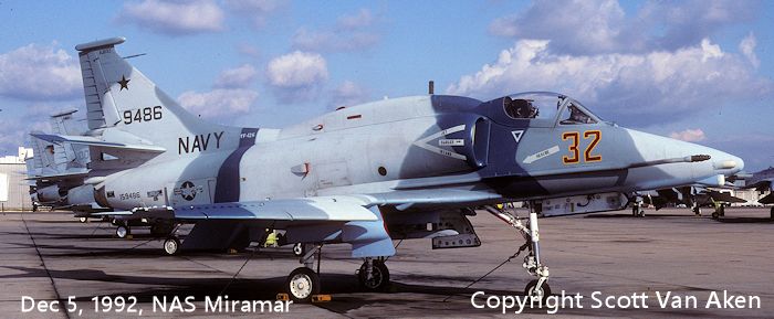 An A-4M from VF-126 in August 1992 is next. The caption says it is from NAS Fallon, but I photographed this plane in December 1992 at NAS Miramar along with the rest of the squadron. It must have been on detached duty when the info photos were taken as the unit stayed at Miramar until disestablished in April 1994. It is in the last scheme worn by most of the squadron's Skyhawks which is blues and greys. A photo of this plane is below. Note that most of the time, these planes carried nothing under the wings or fuselage.