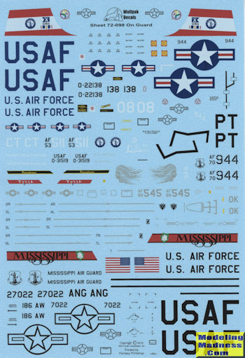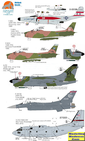 As mentioned, there are kits available for all the subjects so modeling any of these will be easy enough. As usual for Wolfpak, the decals are superbly printed by Fantasy Printshop and the sheet comes with the best background information provided by any sheet in the business. Upper camo schemes are provided for the A-7 and F-86 options. Note that the Fantasy Printshop decals are quite glossy so you'll need a clear matte or semi-matt coat over these once they have been applied.