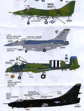 There are four interesting subjects on this sheet, starting with an A-4E from VA-155 during the USS Constellation cruise of 1966. During this cruise, the Navy experimented with camouflage in several shades of green. It seems that at least a few of each unit had planes so painted. It was found not to be that effective and so the experiment remained just that and the surviving planes were repainted when they got back home.