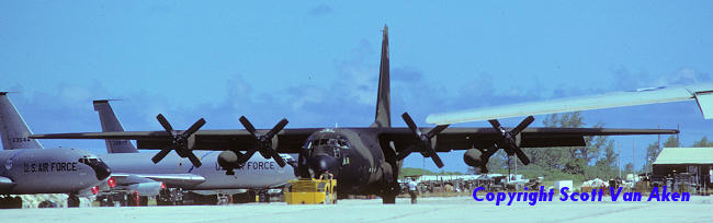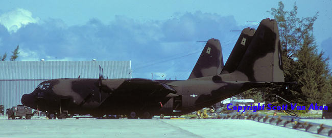 Finally, an MC-130E that was a participant in the Eagle Claw operation to free the Iranian Hostages in 1980. The attempt was a failure for many reasons and while no hostages were freed, all the participants came back home. I was based on Diego Garcia at the time and what I believe are the MC-130s that participated in this venture were originally based there for a short time. Here are two photos I took of the planes. Even when enlarging the images, the serials are nearly impossible to read as they are quite small and the color of the serials blend in so well with the background.