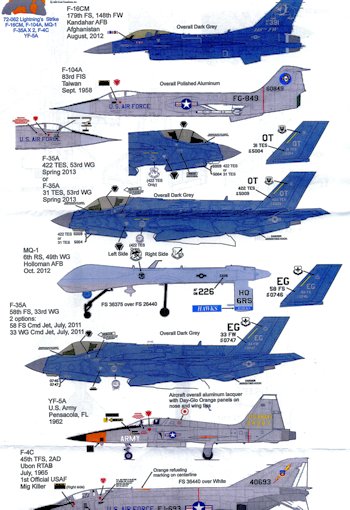 There are three F-35A units on this sheet. The first one contains a plane from the 422 TES and 31 TES of the 53rd Wing from early 2013. These are test units.