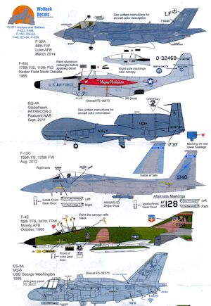 The instruction sheet for this set is the best in the business when it comes to background information and what may be needed to accurately depict the aircraft being modeled. In addition to the actual placement profiles, there are several additional pages of information that include a history of the type, kits and update bits for these schemes, as well as load-out information, and any changes needed to properly model the aircraft in question, assuring you of the most accurate model you can have. A listing of kits and conversion sets is also included. A visit to their web site will get you much larger images of the markings options.