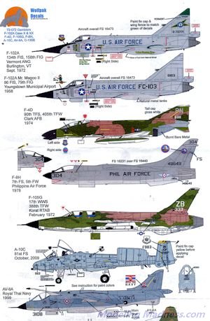 The instruction sheet for this set is the best in the business when it comes to background information and what may be needed to accurately depict the aircraft being modeled. In addition to the actual placement profiles, there are several additional pages of information that include a history of the type, kits and update bits for these schemes, as well as load-out information, and any changes needed to properly model the aircraft in question, assuring you of the most accurate model you can have. A listing of kits and conversion sets is also included. A visit to their web site will get you much larger images of the markings options.