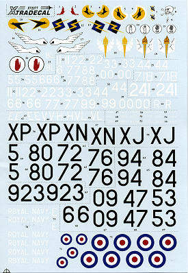 There are a variety of different markings for the various units that operated the plane (which to be complete includes 766, 890, 892, 893, 899 squadrons and RNAY Belfast). There are markings on the sheet for both FAW.1 and FAW.2 aircraft, the main difference being the boom mounted fuel tanks and the weapons that were carried. Some of the common data markings will have to come from the kit sheet.