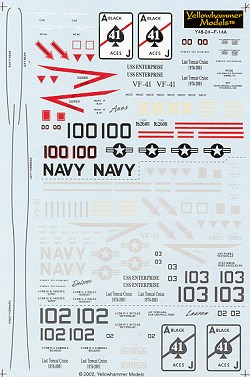 Each of the aircraft is named with /100 being Anna, /102 as Lauren, and /103 being Delores. The sheet contains sufficient markings to do the CAG bird and one of the other two. This cruise was also the last with the Tomcat as VF-41 transitioned to the F-18 Super Hornet upon return to the States.