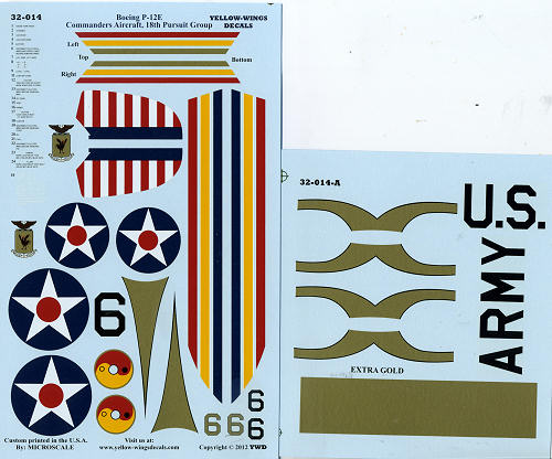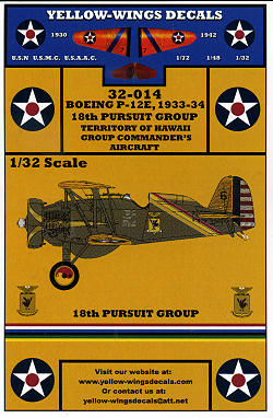 This sheet is for the Group CO of the 18th Pursuit Group based at what is now Wheeler Field in Hawaii during the 1933-34 time period. This has to be one of the most colorful schemes ever applied to a P-12 with its gold trip and multi-colored fuselage and wing bands. Add that to the yellow upper wing and tail surfaces, and you have a very colorful aircraft.