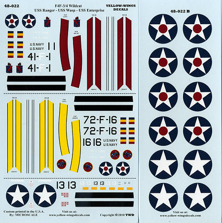Using the sheet cover for a guide, the first is a yellow wings F4F-3 from the USS Wasp in early 1941. This one has the black tail section and yellow bands on the wings and fuselage and cowling. The cowling will need to be painted to match the decals but reference information is provided for that.