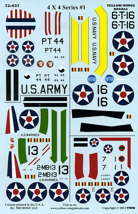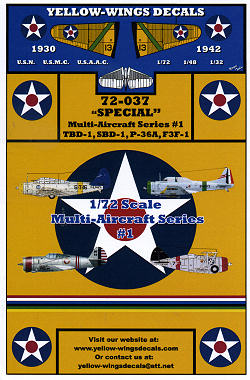 Next is a USMC SBD-1 as attached to VMB-2 at San Diego in 1940. This one has a green forward cowling. The rudder stripes, fuselage and wing bands as well as prop stripes and wing walk areas are all on the decal sheet. No recommended kit is given as there is apparently no -1 Dauntless on the market. However, it should not be that difficult a conversion from later versions available.