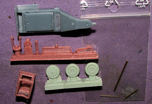Signifer's molding is first rate and one only has to remove the part from the pour stub or remnants thereof and give it a bit of a cleaning before assembly. There is a nice set of instructions for this one and Signifer includes some sections of metal rod to use for axles and the long control arm. You will notice that one also gets a wood cradle used to lift the bomb into place. The cart itself would be in Olive Drab (of course) and you can use the photos of completed cart on the header card or their web site if you need more help with colors.