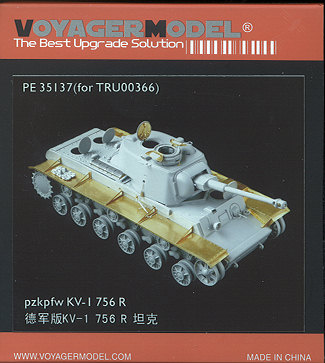 This particular set is for the Trumpeter KV-1, kit # 00366. The box top image is a bit on the misleading side as you don't get the replacement skirts and braces as shown. Instead, this set includes one large and one small etched brass sheet, one stainless steel sheet and a couple of resin and brass bits along with a section of wire and plastic rod.