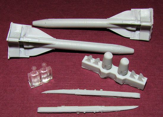 The set consists of a pair of missile bodies with rear fins molded as a single piece. The forward fins and the missile nozzle section are separate. Also separate are the small clear seeker windows, which are molded in clear resin. The set comes with launch rails as well, a very nice addition.