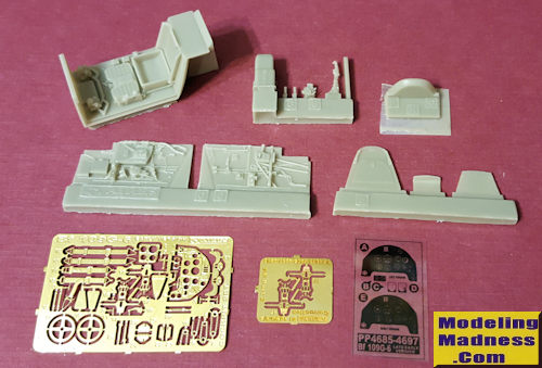 So you get a nice floor with bulkhead piece that has the seat molded in. Two nice sidewalls, an instrument panel mounting piece, a back wall piece and a two piece head armor piece. The small bits are a control stick, 20mm gun housing, gun sight and two tiny resin bits to help hold the head armor in place.