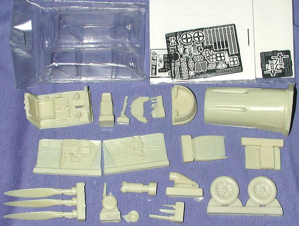 This particular set is to convert the Hasegawa 1/32 Bf-109G-6 kit to the earlier F version. The conversion set is quite complete and includes a full interior, new engine cowling, new oil tank cowling, prop blades, intake, oil cooler radiator and wheels. There is also a very complete etched metal fret that helps to accessorize the cockpit. I've seen this particular set used on a kit and it is a perfect fit on what is a super model. What with the plethora of decal sheets out there already for this version, you can have a great looking model of what most Luftwaffe pilots thought was the best of the 109 series.