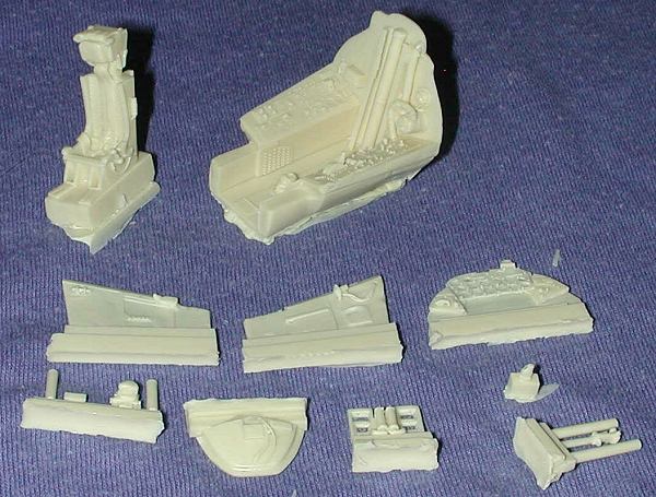 This set includes the tub, an accurate bang seat, side walls, instrument panel, anti-glare sheild, control stick, gunsight bits and rudder pedals. It is also a healthy chunk of resin so will help to keep it on its nose. The only addition you'll have to make is to supply some wire for the ejection seat pull handles.