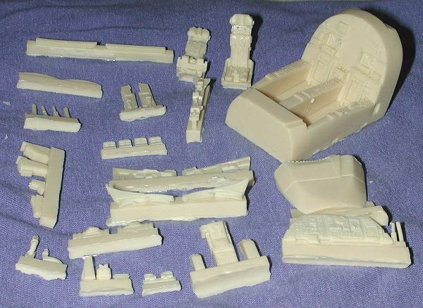 This particular set is for the Academy 1/48 EF-111A. As you may know, this is an area that is in sore need of a decent cockpit. This set should also fit the Zhengdefu version as well since it is a blatant copy of the Academy kit. This is a very full set that includes a complete cockpit tub with seats, instrument panel, side walls, control sticks and all the goodies that fit in the canopy frames. The canopy actuating arms are also included so you can portray this kit with the canopy open. A very complete set and one that really needs to be with your next 1/48 EF-111A.