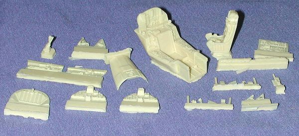 From Black Box comes another in their line of resin cockpit sets. This particular one is for the A-7D Corsair II, the 1/48 Hasegawa kit being the recommended model of choice. As with other sets, this one includes a full interior swap, including a new seat, HUD and parts for the inside of the canopy. It seems as if this is basically the A-7E set with a couple of D parts. I say that because there are two items listed as 'D only'; specifically the instrument panel and the side consoles. To use the new side consoles, you'll have to sand down the ones that are already there.