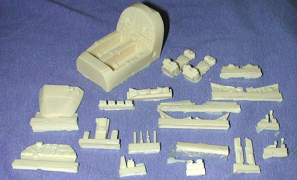 This particular set is for the Academy 1/48 F-111F. As you may know, this is an area that is in sore need of a decent cockpit. This set should also fit the Zhengdefu version as well since it is a blatant copy of the Academy kit. This is a very full set that includes a complete cockpit tub with seats, instrument panel, side walls, control sticks and all the goodies that fit in the canopy frames. The canopy actuating arms are also included so you can portray this kit with the canopy open. A very complete set and one that really needs to be with your next 1/48 F-111F.