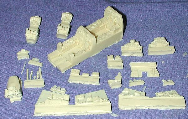 This is another very complete cockpit set for the Hasegawa gun nose Phantoms. It is very complete and consists of a tub, seats, control sticks, rudder pedals, side walls, and a variety of instrument panels depending on if you are doing an F-4E or F-4F. The forward instrument panel is built into the anti-glare panel. You'll have to do a bit of careful sanding to get this set to fit atop the nose wheel bay and of course, you'll also have to cut out the kit anti-glare panel, and the section between the cockpits on the fuselage halves. It looks like a really super interior and one that should really highlight your next Phantom kit!